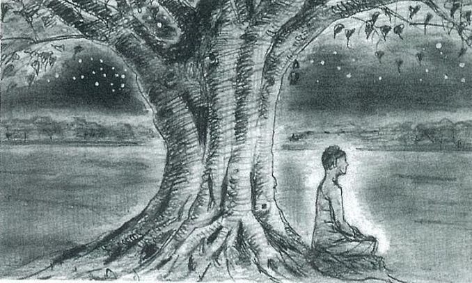 Pendant plusieurs années, il se soumet à des disciplines ascétiques, mais il finit par comprendre qu’il est impossible d’atteindre l’émancipation par le biais de l’auto-mortification et finit par rejeter ces pratiques. Puis, non loin de la ville de Gaya, il s’installe sous un figuier et entre en méditation. C’est là qu’il atteint l’illumination et s’éveille à la véritable nature de la vie et de toutes choses. C’est en raison de cet éveil qu’on l’appelle Bouddha, ou l’« Éveillé ». Après son illumination, Shakyamuni serait resté quelque temps sous l’arbre, dans la joie de son émancipation, tout en étant préoccupé par la difficulté qu’il aurait à transmettre aux autres ce qu’il a compris. Enfin, il se résout cependant à s’y employer pour que la voie de la libération des souffrances des naissances et des morts puisse s’ouvrir à toutes les personnes.